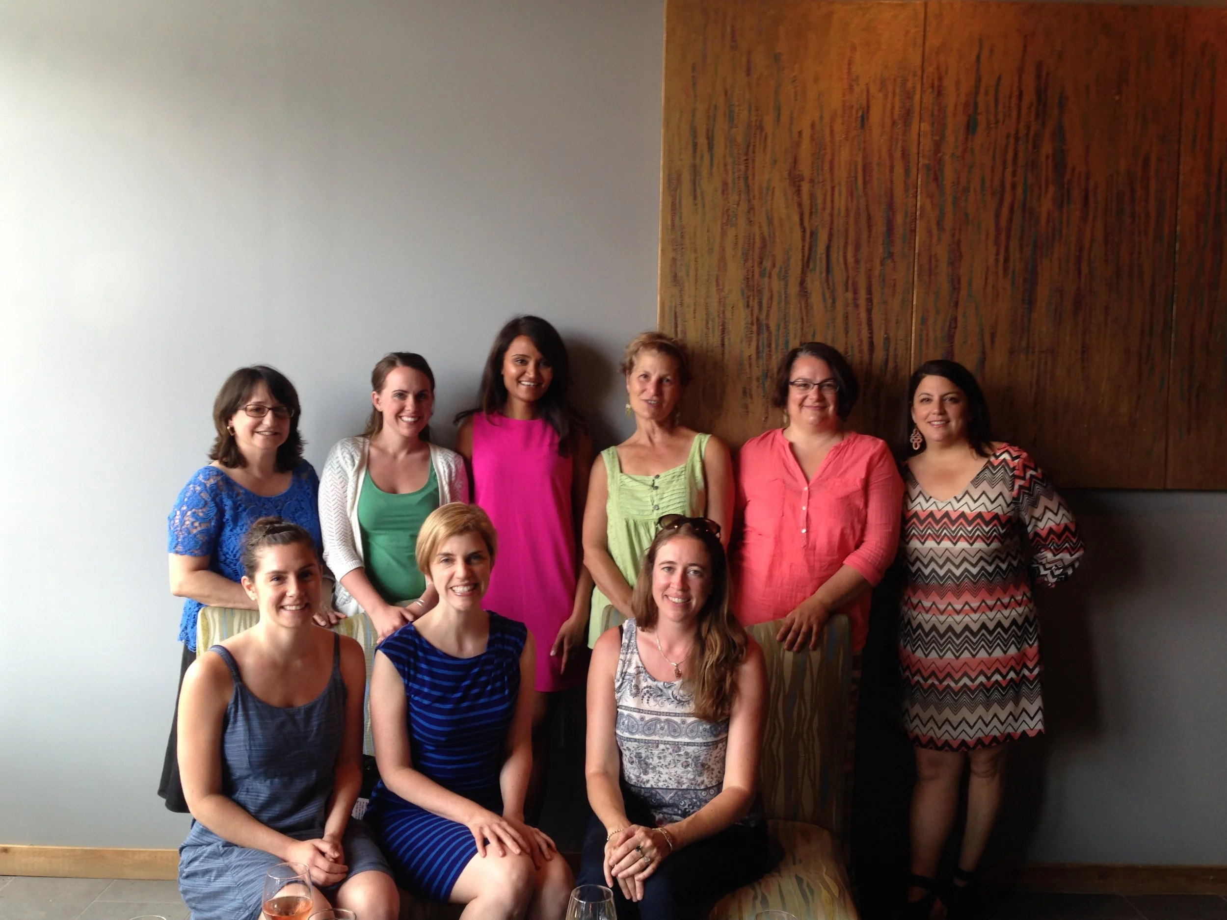 A group of ten women posing together indoors, some sitting and some standing, with a large wooden panel on the wall behind them. View fullsize