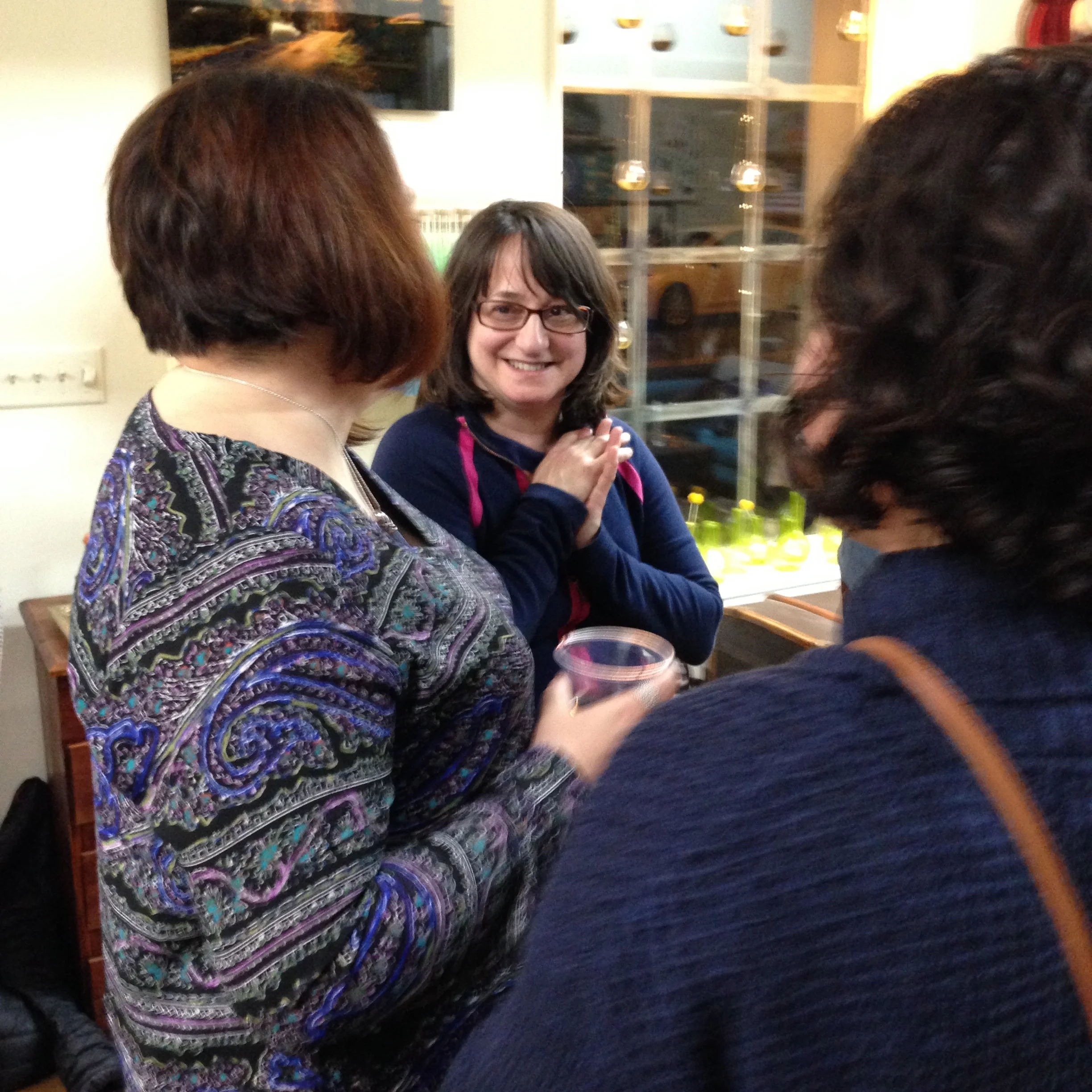 A woman with glasses and dark hair smiling and holding her hands together while talking to two women with curly and auburn hair in a cozy indoor setting.