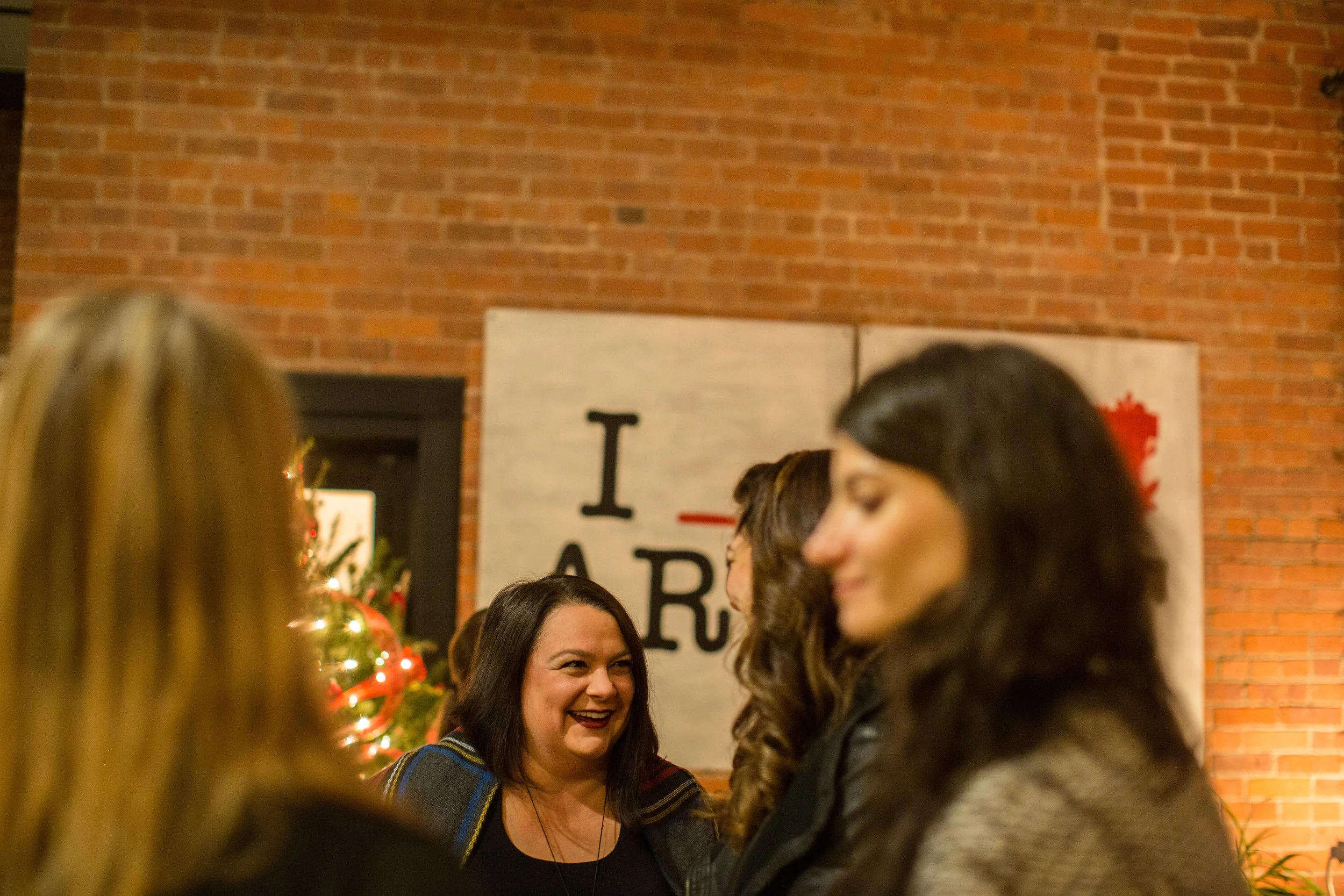 A group of women smiling and talking at a social gathering indoors, with a Christmas tree and a sign with partially visible text in the background.