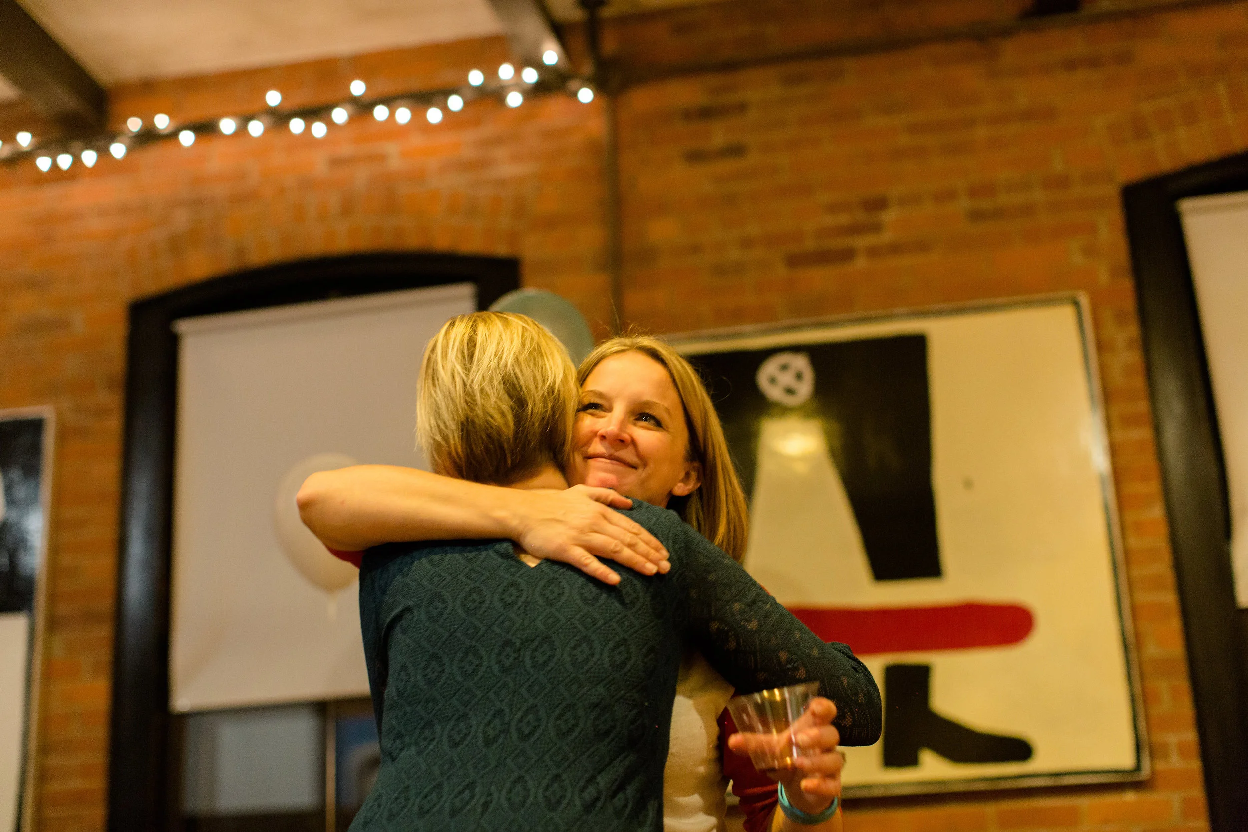 Two women hugging at a party or gathering, one woman holding a glass, with a brick wall and abstract art in the background. View fullsize