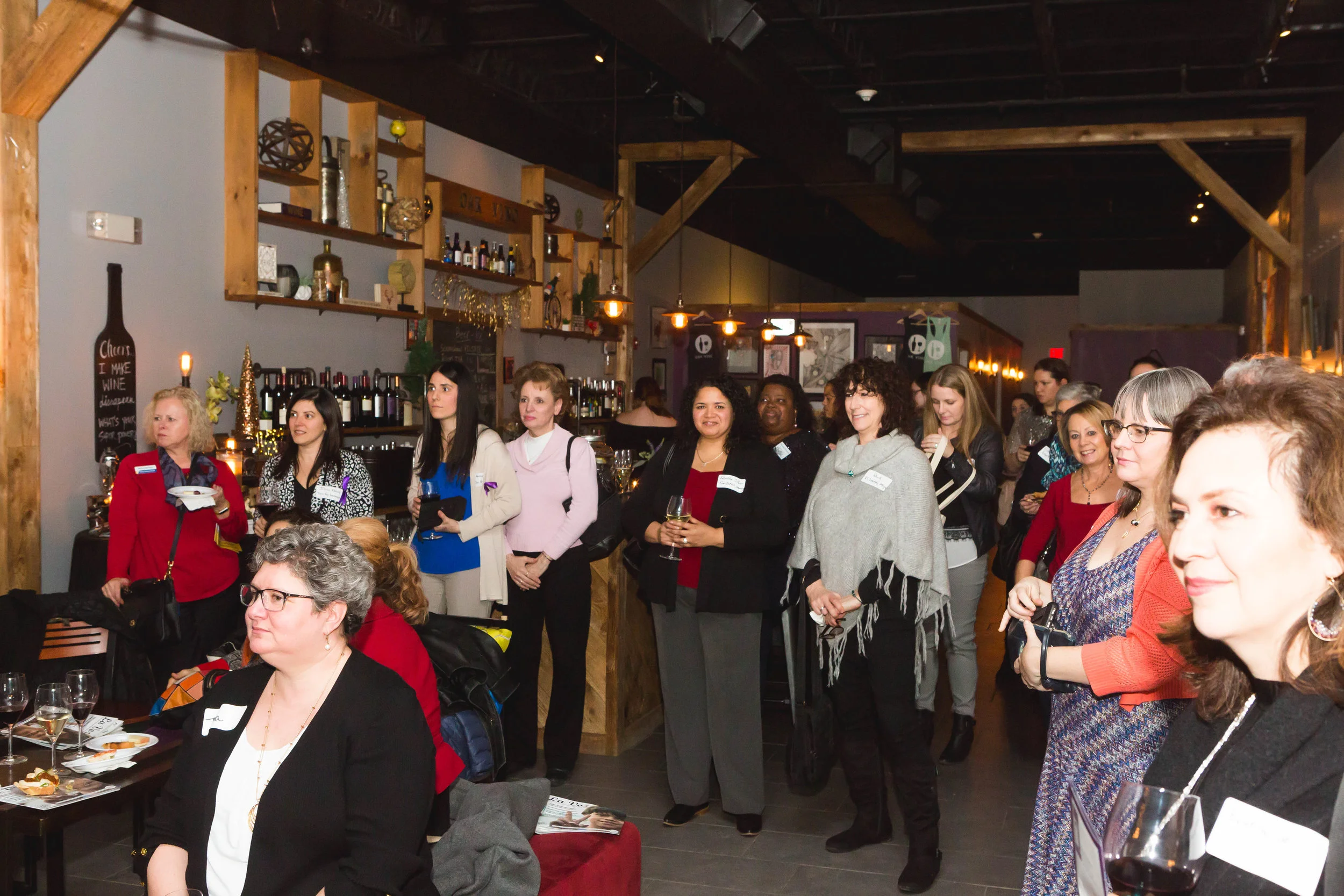Group of women at an indoor event, some standing and some seated, in a restaurant or bar setting. View fullsize