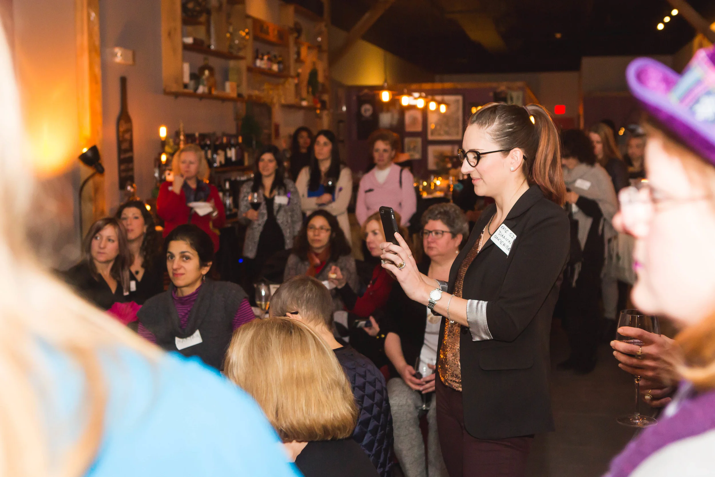 A woman with glasses and a ponytail, dressed in a black blazer, is taking a photo or video with a phone at a gathering in a warmly lit bar or restaurant. Several people are watching her, some seated and some standing, holding drinks, with a cozy deco
