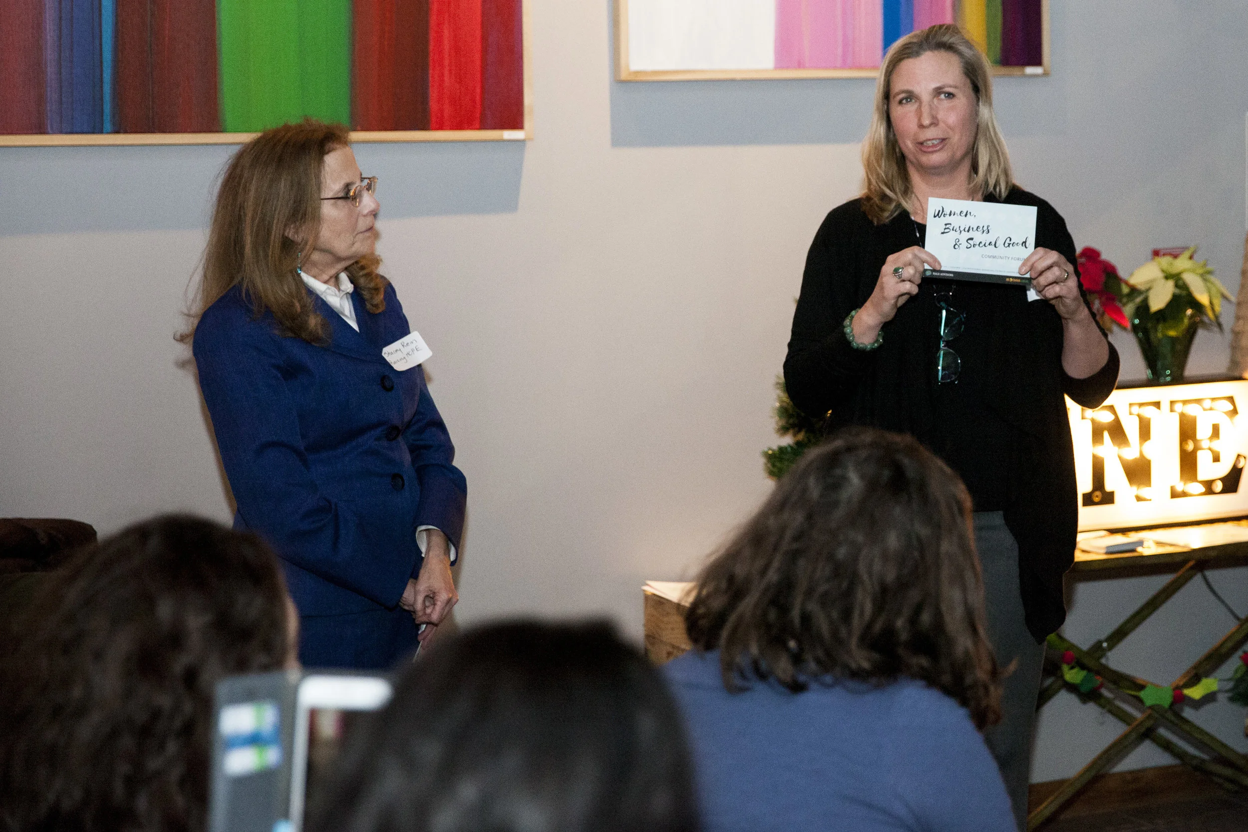 Two women speaking to an audience at an indoor event, with a colorful wall art in the background and a decorative light-up sign that partially reads 'NE', with some audience members visible in the foreground. View fullsize
