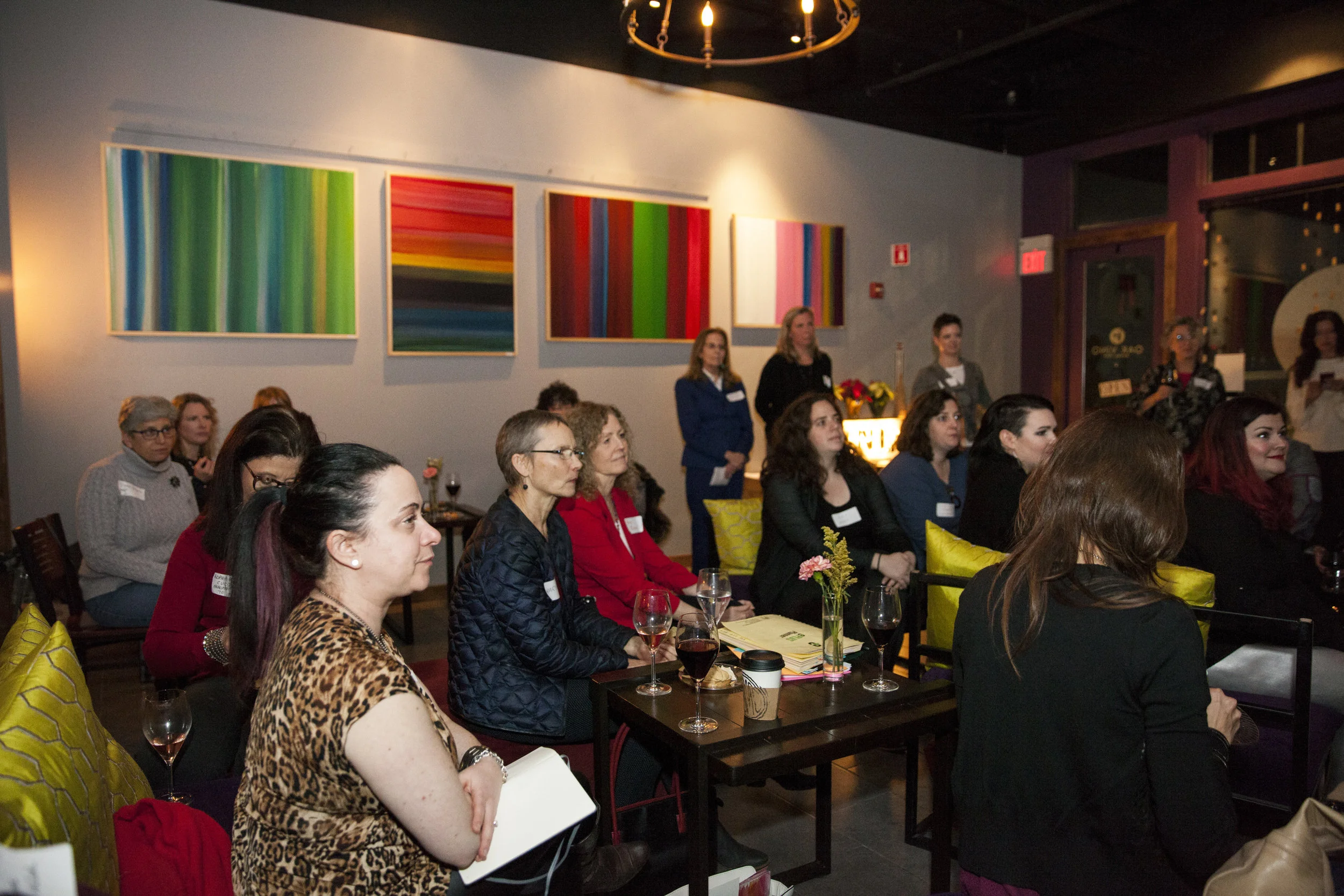 A group of women seated in a dimly lit room, attentively listening to a presentation or speaker. Some have glasses of wine, and there are colorful, abstract paintings on the wall behind them. View fullsize
