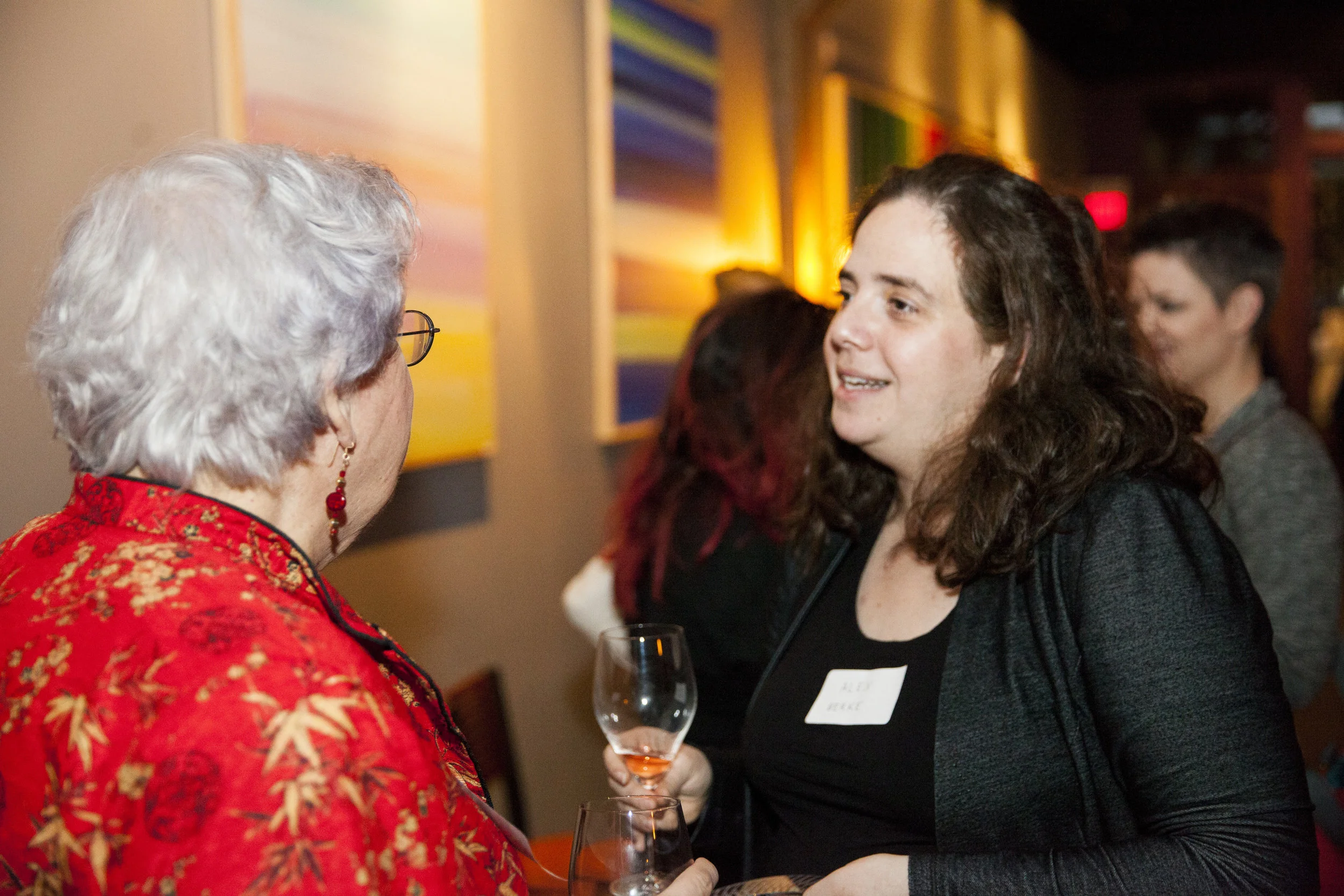 Two women having a conversation at a social event, holding wine glasses, with colorful artwork on the wall behind them. View fullsize