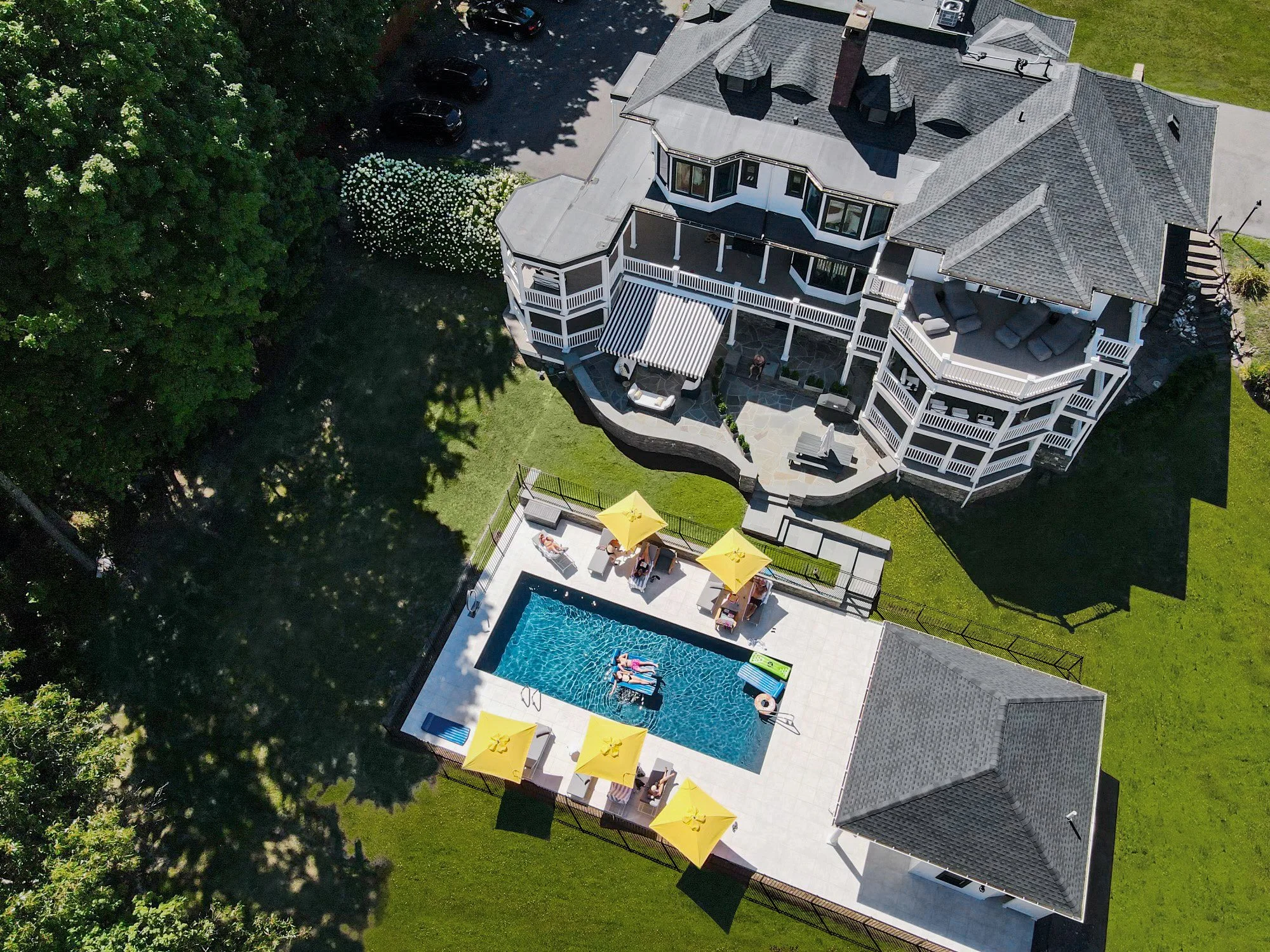An aerial view of a large house with a backyard pool, surrounded by green lawns, trees, and parked cars. The pool area has yellow umbrellas, lounge chairs, and people swimming and relaxing.
