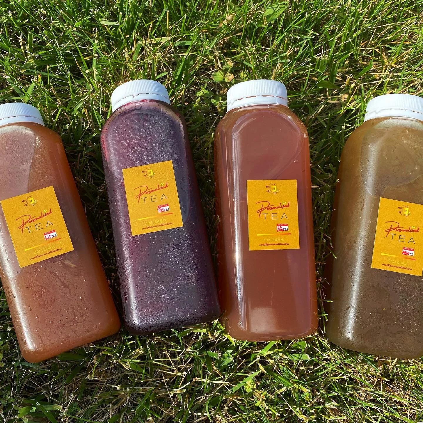Four bottles of flavored tea lying on grass, each with a yellow label reading 'Personalized Tea' and a small red and white tag.