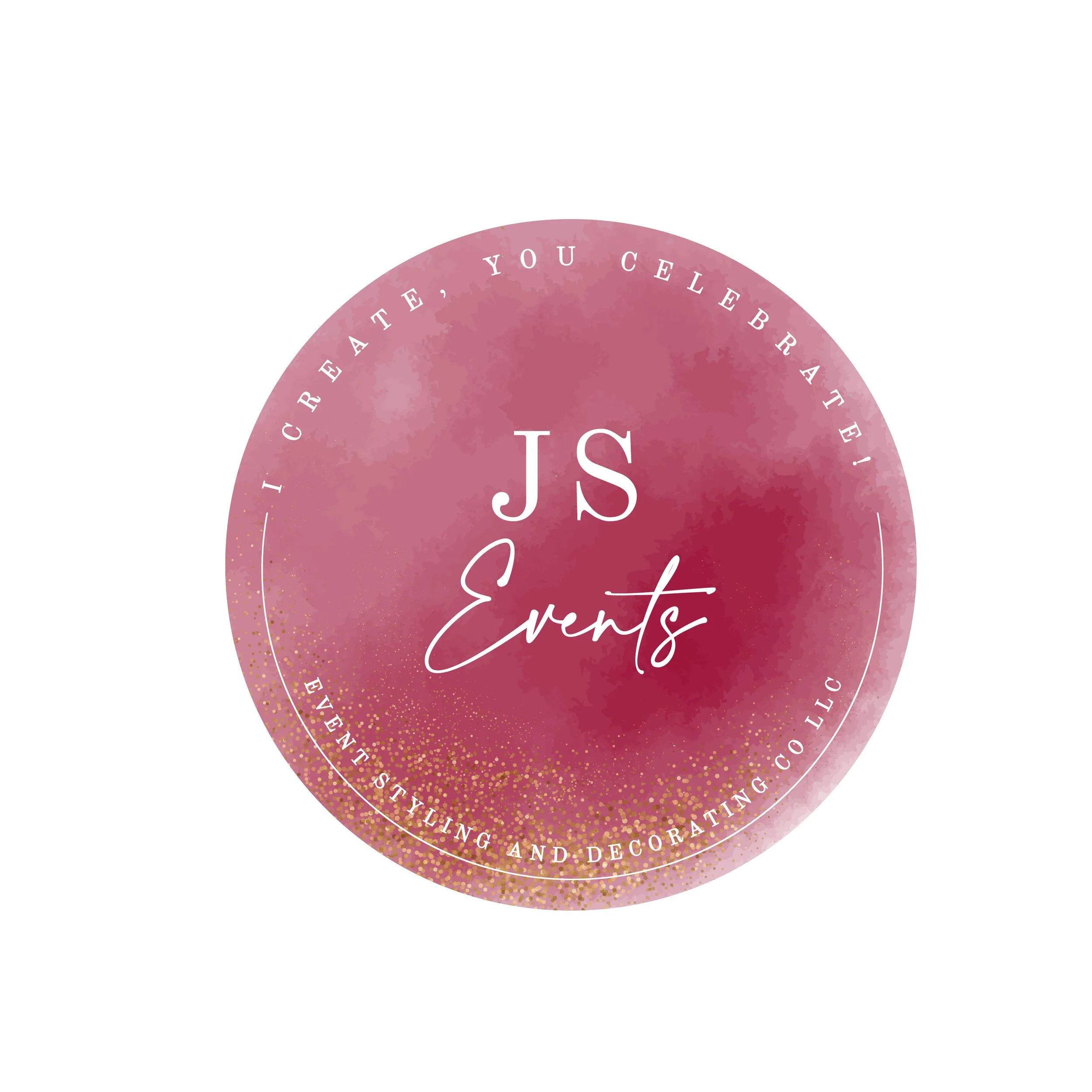 Round logo for JS Events with a pink watercolor background and gold confetti accents, featuring the text 'JS Events' in the center, and the motto 'I create, you celebrate!' along the top edge. View fullsize
